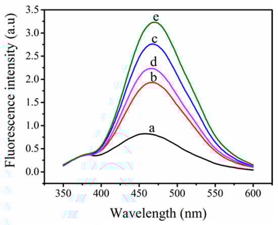 An LS-55 fluorescence spectrometer of PerkinElmer (Shanghai, China) was used to record the fluorescence spectra. The emission spectra were recorded in the range from 350 to 600 nm with both excitation and emission slits of 10 nm. All fluorescence detections were carried out under room temperature.