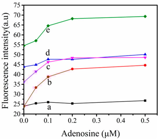 The concentration ratio (TPE-2N+): ABA (μM:μM) of the detection system was also optimized. The ratio of (TPE-2N+): ABA as 5:0.5, 10:0.1, 10:0.3, 10:0.5, and 20:0.5 were investigated. As shown in Figure 2, in cases of 5:0.5 and 10:0.5, the fluorescence response shows little dependence on the concentrations of adenosine (Figure 4). The adenosine concentration dependence of fluorescence response was observed under (TPE-2N+): ABA ratio of 10:0.1, 10:0.3 and 20:0.5 (Figure 4, curve b, c and e), the fluorescence intensity of the systems increase greatly within the adenosine concentration range of 0–0.2 μM. Although the fluorescence intensity is higher under (TPE-2N+): ABA ratio of 10:0.3 and 20:0.5 (Figure 4, curve c and e), the background value was much greater than b. Hence 10:0.1 was chosen as the optimal condition for the probe.