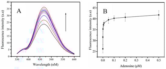 Aptamers [] are single-stranded oligonucleotides that have specific recognition function for peptides, proteins, and small organic molecules. The specific recognition function of aptamers for target molecules is based on their unique sequences and three-dimensional folded structures. Aptamers can undergo significant conformational changes into hairpins, stem-loops, or G-quadruplexs after they bind to their targets. The Aptamer that can specifically bind adenosine has been found. It is a G-rich oligonucleotide and can form G-quartets structures in the presence of adenosine [,].