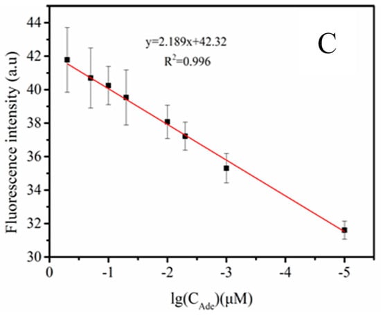 The ability of this fluorescence aptasensor for the quantitative detection of adenosine was studied under the optimized conditions. Figure 5A shows the different fluorescence responses to adenosine of various concentrations. As can be seen from Figure 5B, the fluorescence response increased dramatically when the concentration of adenosine increases from 0 to 0.1 μM. A linear relationship between the fluorescence response and the concentration of adenosine is obtained according to the equation of Y = 42.32 + 2.189X, where Y is the relative fluorescence intensity, and X is the logarithm of adenosine concentration Figure 5C. The linear concentration range is 10 pM to 0.5 μM with an R2 of 0.996. So that the detection limit of the aptasensor for adenosine can be 10 pM.