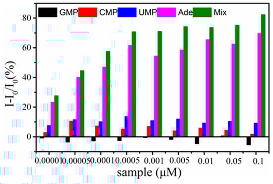 The fluorescent response of the proposed aptasensor towards adenosine and the three analogues: guanosine, uridine and cytidine, and the mixture of adenosine with the analogues. The concentration of all samples were 0.00001, 0.00005, 0.0001, 0.0005, 0.001, 0.005, 0.01, 0.05, and 0.1 μM.
