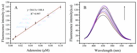 To investigate the practical application of the probe in more complicated conditions, the detection of adenosine was carried out in human urine samples. A healthy urine was used as the blank sample; adenosine was added to prepare the spiked samples. The spiking concentrations were 0.01, 0.05, and 0.1 μM. The sample solutions were diluted 100 times before the detection. A working curve was also made using the healthy urine, and a linear regression equation for adenosine was obtained from a calibration curve using concentrations from 0 to 0.1 μM. A number of detections were carried out to investigate the precision and recovery of the probe.