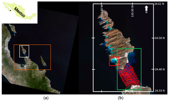 Landsat scene: LC80340432013292LGN00. (a) whole image with study area (orange rectangle), and Espiritu Santo island and the SLC (white rectangle); (b) red square is the area used for parameter calibration, and green rectangle is the SLC.