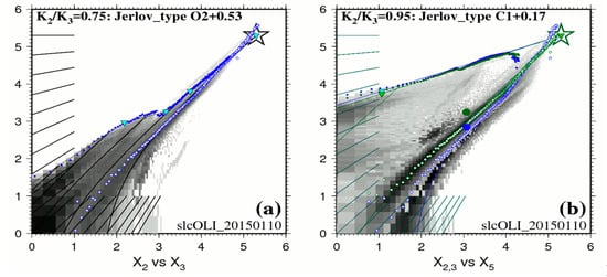 Plot of linearized calibration data (Equation (4)) for the whole of the 29 January 2016 scene. Bands 2, 3 and 5 are Blue, Green and Red, respectively. (a) is the calibration diagram of linearized Blue (X2) and Green (X3) and reports estimated K2/K3 values with Jerlov water types. (b) is the calibration diagram for Blue (X2), Green (X3) and Red (X5) bands respectively. The backdrop in shades of gray represents the bi-dimensional histogram for all image pixels (white ROI in Figure 1). Blue dots are the actual pixels used for BPL calibration, each referenced to its row/line position in the image. Small white circles represent the scatter of averaged bare land pixels, as a proxy for the Soil Line.