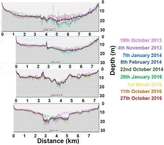 Single scenes are inevitably affected by alien features that impact the result (e.g., boats and their wakes, small clouds and their shadows, algal blooms, local variations of water optical properties, etc.). Therefore, a combined depth image can be produced by averaging all the retrieved depths that satisfy some quality criteria: for each shallow pixel, first an average depth is calculated; then depths that are outside the standard deviation range are excluded and a new average is calculated. This eliminates discrete artifacts without any smoothing. One can see for example in Figure 3 that, on 4 November 2013 (purple profile), a major depth under-estimation affects the southern half of the deep SLC between 4 km and 5 km on Profile A; an increase in turbidity possibly caused this artifact. These profiles also show that the depth combination reduces much of the noise without any smoothing.
