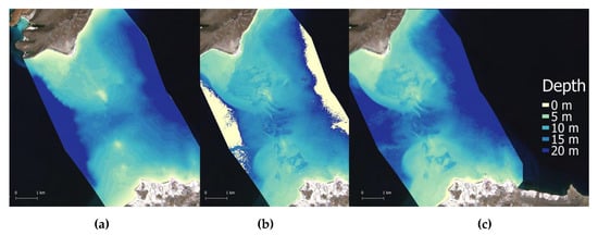 (a) is the interpolated DTM of groundtruthed depth points; (b) is 4SM satellite retrieved depth layer from 19 October 2013; (c) is satellite retrieved depth layer processed with ENVI-SPEAR tool on the same scene.
