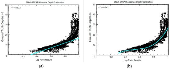 Eight scenes were processed with the ENVI-SPEAR tool over the same ROI as 4SM (Figure 1). This tool operates the Log Ratio Transform algorithm developed by Stumpf et al., [22]. It is integrated in the ENVI software (Exelis Visual Information Solutions, Boulder, CO, USA, v.5.3) as a Spectral Processing Exploitation and Analysis Resource (SPEAR) tool, from now ENVI-SPEAR tool. This tool is capable of retrieving relative depths from multispectral images which then are calibrated into meters using an existing depth sounding dataset. To this end, the groundtruthed DTM described above were used. An example of the output is shown in Figure 4c. Alien features were masked. Then an approximate atmospheric correction was applied on the whole image by Dark Pixel Subtraction. Images were pansharpened, then the Log Ratio Transform algorithm was applied. A 3 × 3 median filter was chosen to remove high frequency noise. Then all groundtruthed depth points (n = 5004) were used to calibrate relative depths into absolute depths. In the calibration tool (Figure 5), it is possible to select a model that best fits data based on r2 results (linear, exponential, polynomial model). To compare different results, a linear fitting (Figure 5a) and the model with the highest r2 were chosen for each scene (e.g., Figure 5b).
