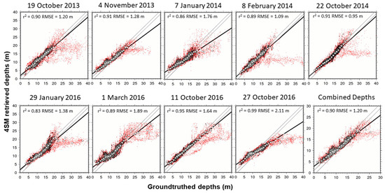 As regards 4SM results, linear relationships between retrieved depths and groundtruthed depths are shown for each scene in Figure 6. The regression lines do not account for all depth pairs; red outliers are excluded from the statistics. Linear regression model explained in excess of 80% of the depth variations. The 27 October 2016 scene reports the highest r2 (0.99) although it also reports the highest RMSE (2.11 m). The 22 October 2014 scene scored the lowest RMSE. From Figure 6 it is also possible to see how combining depths improved linear fitting results and reduced the noise.
