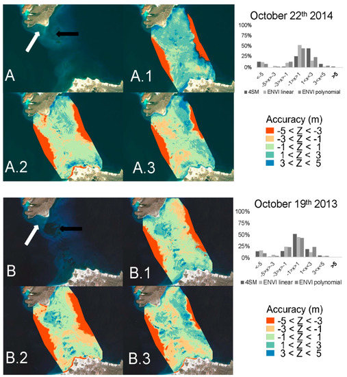 Results of the accuracy assessment on retrieved depth for 4SM and ENVI/SPEAR tool methods. The accuracy index is classified as follow: blue tones for two depth overestimation classes, red tones for two depth underestimation classes, and turquoise tone where the residual is less than 1 meter. Barplots show the percentage of pixels that belong to each of these classes. (A) is a Landsat RGB color composite view of 22 October 2014, white arrow indicates an example of bright shallow bottom, while black arrow represents darker shallow bottoms. (A.1) is 4SM accuracy index; (A.2) is the accuracy index calculated on ENVI-SPEAR with line model calibration; (A.3) is the accuracy index calculated on ENVI-SPEAR with polynomial model calibration. Topright barplot reports % of pixels belongings to each index classes: <−5 m difference class is due to the detection limit constraint of remote sensing in coastal water, since it is represented by pixels in deeper waters. (B) is a Landsat RGB color composite view of 19 October 2013, (B.1) is 4SM accuracy index; (B.2) is the accuracy index calculated on ENVI-SPEAR with line model calibration; (B.3) is the accuracy index calculated on ENVI-SPEAR with polynomial model calibration. Topright barplot reports % of pixels belongings to each index classes calculated on the scenes.