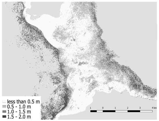 Depth residuals are defined by the absolute difference between combined 4SM depths and DTM. Depth residuals are represented graphically in Figure 8. Most of the depth residuals were ≤0.5 m, especially over bright shallow and deeper (≈15 m) substrate, where 4SM showed more consistency. Conversely, higher residuals were found in two areas corresponding to darker bottoms (see also Figure 7A,B black arrows). Over time this area showed a change in bottom properties, when in 22 October 2014 a large portion of a low albedo patch on the northern side disappeared and wasn’t recorded anymore. Finally, it is evident how areas below 20 m were the ones that showed higher residuals, where depth retrieval reaches its optical limit in this environment.
