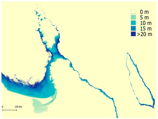 Moreover, the application of combined depths improved model fitting results; however, it did not improve accuracy compared to other scenes. Strong depth residuals (>2 m) can hardly be interpreted in this case as caused by natural or anthropic events; they are likely noise in depth retrievals due to local perturbations like atmospheric or hydrological effects, but also phytoplankton blooms, turbid waters, wind or even boats wakes. Therefore, any pixel that shows this kind of variation should not be considered in the overall depth model. Combining depths is an important tool in reducing these types of noise (that are inevitable for the practitioner). The fact that most of the pixels depth residuals less than 0.5 m (Figure 8) in the 0 to 20 m depth range is supports 4SM as a robust depth retrieval method that can cope, to a limited extent, with a layered structure of the water column.