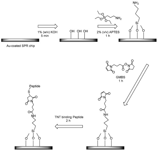 Immobilization procedure of the 2,4,6-trinitrotoluene (TNT) binding peptide on the surface of the surface plasmon resonance (SPR) Au-chip. APTES: 3-aminopropyltriethoxysilane; GMBS: N-γ-maleimidobutyryl-oxysuccinimide ester.
