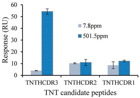 Screening TNT binding peptide among candidate peptides TNTHCDR1, TNTHCDR, and TNTHCDR3 using an APTES-based chip. The error bar indicates the calculated standard deviation (n = 3). RU: resonance units.