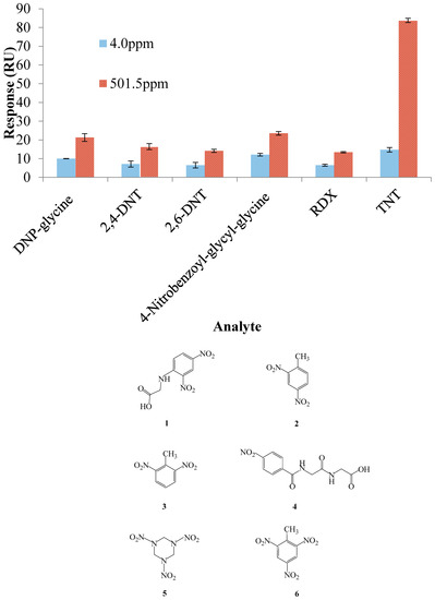 In our previous work [16,17,18,19], the displacement method and competitive inhibition method based on an SPR immunosensor were exploited for the detection of TNT. Although these methods offered more sensitive detection (ppt–ppb) through an antibody-based SPR immunosensor, they suffered from complicated TNT antibody preparation, large amounts of consumption of extremely expensive reagents, and surface damage caused by regeneration with the strong regeneration solution. Unlike the TNT antibody, the TNT binding peptide could be easily chemically synthesized according to the obtained amino acid sequence with excellent storage stability. The inset of Figure 3 shows the reproducibility of the sensor chip. The TNT concentration was chosen at 501.5 ppm, which required regeneration. The binding response of the sensor was decreased mainly because of the degraded peptide activity caused by surface regeneration. The selectivity of the rationally-designed TNT binding peptide TNTHCDR3 was also investigated (Figure 4). The results clearly showed that the TNTHCDR3 peptide has a strong preference for binding TNT over five kinds of TNT analogues: DNP-glycine, 2,4-DNT, 2.6-DNT, RDX, and 4-nitrobenzoyl-glycyl-glycine. The highest concentration allowed of these analogues was 501.5 ppm and the lowest concentration was 4.0 ppm. Analysis of these results revealed low non-specific binding and high specific binding between TNT and TNTHCDR3, demonstrating that the TNT binding peptide was successfully rationally designed and screened through the other two TNT candidate peptides. Furthermore, to our knowledge, this is the first report that uses a TNT binding peptide-based SPR sensor for direct measurement of TNT. The results shown above illustrate that the TNTHCDR3 peptide-anchored SPR sensor was successfully fabricated for TNT explosive detection, which opens up development avenues for future LMW detection.