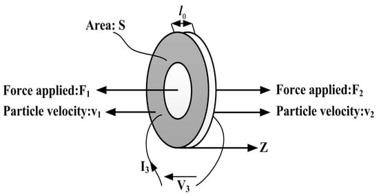 , are the external forces applied to the back and front surfaces of the piezoelectric ceramic ring, is its thickness, indicates its cross-section area, and represent the particle speed, , denotes the voltage and current respectively and the axis indicates the vibrating direction as shown in Figure 3.