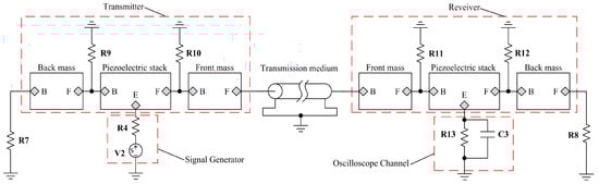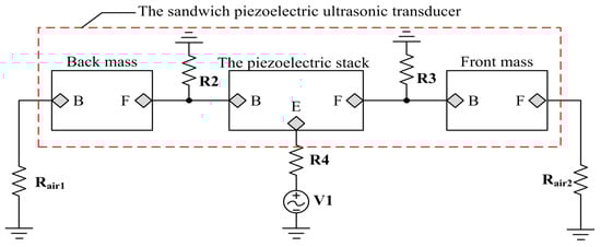 On the basis of the above analysis about the modeling of the piezoelectric stack and the metal masses, we can obtain the PSpice model of the sandwich piezoelectric ultrasonic transducer from Figure 9.