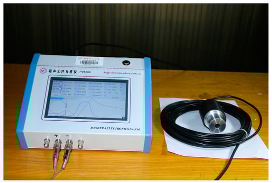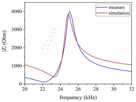 The impedance analysis is used to research the frequency response and derive the resonance and antiresonance frequencies. Moreover, the measured impedance results are obtained by utilizing the impedance analyzer PV520A which is made by BEIJING BAND EAR CO (Beijing, China), LTD as shown in Figure 10. The impedance analysis results of the sandwich ultrasonic transducer are shown in Figure 11. The resonance and anti-resonance frequencies of the measured and simulated are specially shown in Table 5. From Table 5, and represent the simulated and measured frequencies of a sandwich piezoelectric transducer, respectively and . Also, and represent resonance and anti-resonance frequencies, respectively. From Table 5, it can be found that the measured results have good consistency with the simulated results.