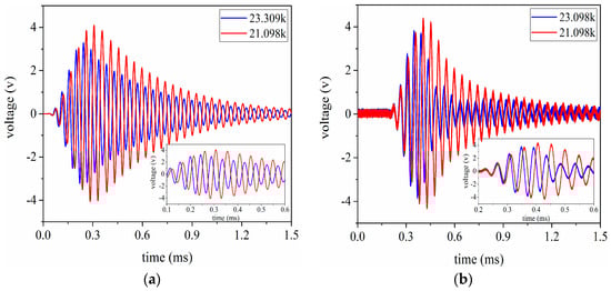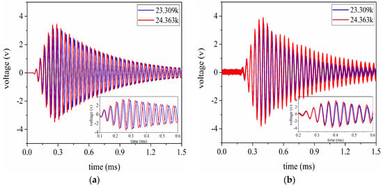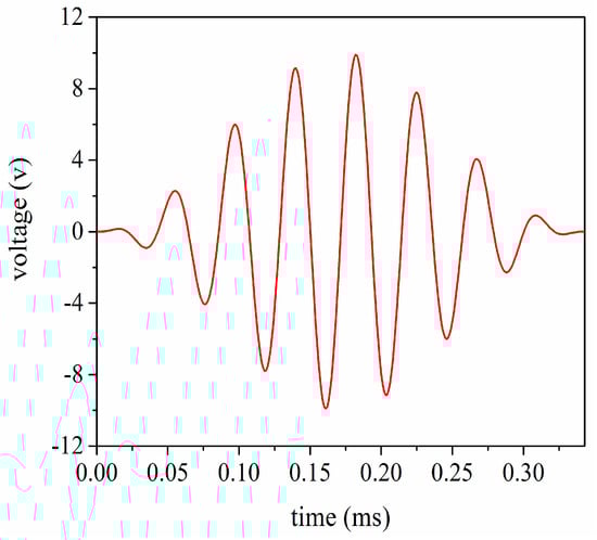 The voltage signals are received by the ultrasonic transducer under the conditions that the aluminum cylinders are 20 mm and 100 mm in length respectively. Simultaneously, these signal data are recorded by the oscilloscope. By using these recorded data, the signal waveforms received in the time domain are given as shown in Figure 17 and Figure 18. According to Figure 17 and Figure 18, it can be easily found that the simulated results have good consistency with the experimental ones. In addition, the conclusion can also be drawn that the optimal excitation frequency for the pitch-catch setup is not necessarily the resonance frequency for the sandwiched ultrasonic transducer, because the resonance frequency can be obtained under the condition of no load.