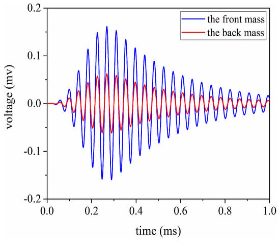In order to investigate the vibrational velocity ratio between the front and back masses, the transient analysis is carried out using the 8 cycle single tone signal by modulated Hanning window as shown in Figure 12. At the same time, in order to obtain the large vibration speed in the front mass, the front and back masses chose heavy metals and light metals, respectively. According to the momentum conservation law, we can get