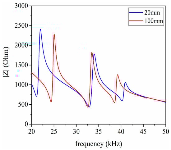 In the first place, for the purpose of obtaining the resonance frequencies of the pitch-catch setup, the AC analysis is performed under the conditions of the length of the transmission medium having the value 20 mm and 100 mm. But the excitation source from Figure 14 need to be substituted by the AC voltage source which is the same as . The impedance analysis result is given as shown in Figure 15. According to Figure 15, it can be found that the first resonance frequencies are 21.098 and 24.363 in kHz, respectively.
