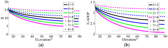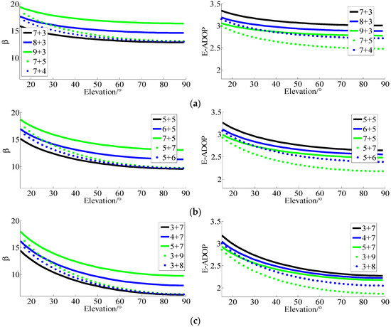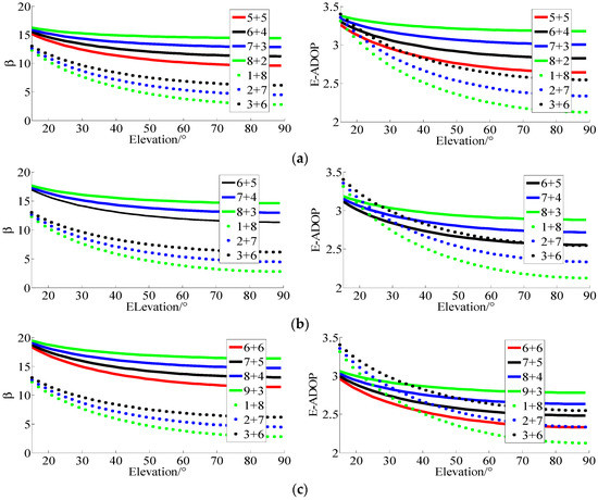 β of dotted lines are smaller than those of solid lines. At the same time, all values of E-ADOP of dotted lines are always smaller than those of solid lines when their corresponding elevations are larger than a certain level respectively, and, the larger the elevations of high-elevation satellites are, the more obvious the difference is, which is attributed to the large number of high-elevation satellites or SMRW. Therefore, according to Equation (17), we can conclude that, compared to the case where low-elevation satellites are the majority or low- and high-elevation satellites are equally distributed, when the high-elevation satellites are the majority, even if there are fewer satellites than in the first two cases mentioned above, the SMRW is the dominant factor to make E-ADOP smaller. However, the difference in number of satellites between solid line and dotted line is not large.