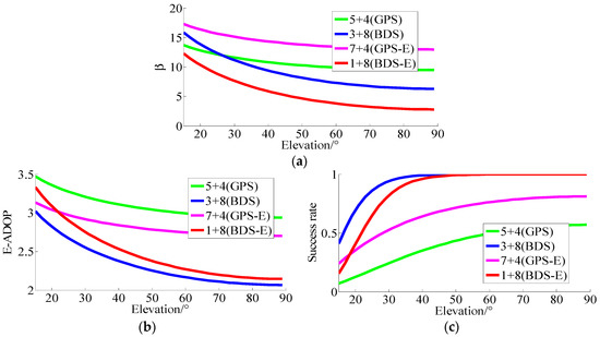 β becomes larger. Therefore, based on Equation (17), the number of satellites is the dominant factor to control of E-ADOP when low-elevation satellites are added.