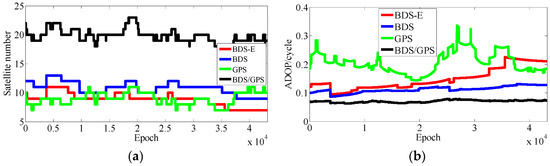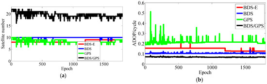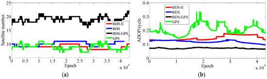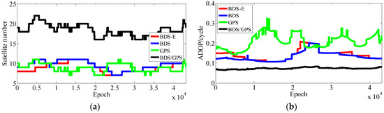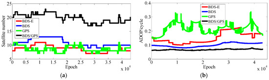 According to the above analyses, few conclusions can be made: (1) the number of satellites mainly makes E-ADOP smaller when satellites are added; (2) when the number of satellites is constant, the greater the proportion of high-elevation satellites is, the smaller the E-ADOP is, i.e., the SMRW is the dominant factor that makes E-ADOP smaller; and (3) in contrast to the systems where the satellites with low-elevation are the majority or where low- and high-elevation satellites are equally distributed, in the systems where the high-elevation satellites are the majority, the SMRW makes E-ADOP smaller, even if there are fewer satellites than in the previous two cases, however, the difference in number of satellites should not be large and it can be further expanded as the proportion of high-elevation satellites becomes larger or the elevations of high-elevation satellites become larger. Conclusions (1)–(3) apply equally to ADOP.