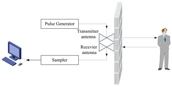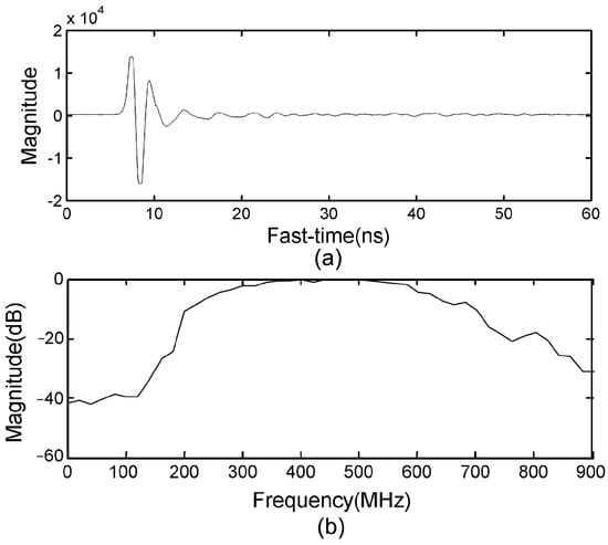 The UWB radar setup is shown in Figure 1. The UWB radar is stuck on the wall with two bow-tie dipole antennas, which are employed for transmitting and receiving the electromagnetic wave, respectively. A pulse generator produces trigger signals with a pulse repetition frequency of 128 kHz. The pulse signals are sent to the transmitter and shaped into bipolar pulses for exciting the transmitter antenna. The echo pulses are received by the receiver antenna, which is identical to the transmitter antenna. Then, the received pulses are sampled by means of equivalent-time-sampling with different time delay, thus, the signals of different ranges away from radar can be obtained. These signals were integrated and amplified, then stored in the form of waveforms through the digital signal processor. The waveforms are sampled into 2048 points. The recorded duration is 60 ns, and the detection range was up to 9 m. Considering that the UWB radar will be used for life detection and identification after an earthquake, it demands that the radar guarantee adequate penetrability and spatial resolution. Thus, the bistatic UWB radar with a center frequency and bandwidth of 500 MHz, respectively, was employed. A received waveform and its spectrum are shown in Figure 2a,b, respectively.