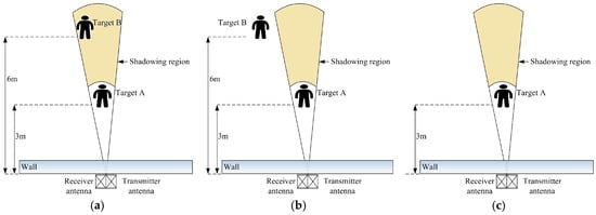 (a) Target A stood at 3 m in front of the antennas, while target B stood at 6 m in the shadowing region of target A; (b) target A stood at 3 m in front of the antennas, while target B stood at 6 m out of the shadowing region; and (c) target A stood at 3 m in front of the radar antennas.