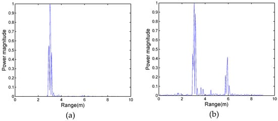 After pre-processing, the power spectrum of the data in Figure 3a was calculated; the result was shown in Figure 4a. Meanwhile, experimental data of Figure 3b were processed by the same method and the power spectrum is shown in Figure 4b. In previous studies, the magnitude of the power spectrum in the range dimension represents the degree of the signal power at different ranges []. In Figure 4a, the maximum peak appears at a distance of 3 m, which corresponds to the location of target A. However, target B cannot be detected, since he stood in the shadowing region. Figure 4b shows that there are two peaks that appear at distances of 3 m and 6 m, respectively; the magnitude of the peak at a distance of 6 m is smaller than that at 3 m. This is because of the attenuation of the electromagnetic wave of the radar as the distance increases. Therefore, the traditional power spectrum method is not credible for detecting multiple human targets, especially in the case with the shadowing effect.