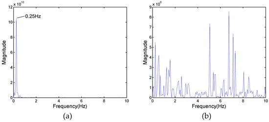 In Figure 3a, as a result of target A partially reflecting the energy of the electromagnetic wave, the energy reflected from target B is reduced compared with the energy from the same position of a single person (only one person standing at 6 m). Fortunately, although the power spectrum of target B cannot be observed in Figure 4, the signals of target B are also received by radar antenna. Figure 5a shows the frequency spectrum of target B in Figure 3a. The signals have many frequency components; a principal frequency of 0.25 corresponds to human respiration. In order to find the features of the signals of target B, who is located in the shadowing region, the signals of the same position in Figure 3c were processed, and the result is shown in Figure 5b. There are wider bands with more complex frequency components than Figure 5a.