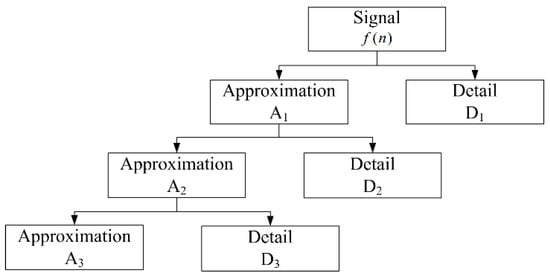 Based on Equations (5) and (6), the signal is iteratively decomposed as the number of levels increases. Thus, a hierarchical set of approximations and details can be obtained through various decomposition levels. In this paper, the example of the three-level wavelet decomposition of signal is shown in Figure 7. Firstly, is split into an approximation A1 and a detail D1. Secondly, the approximation A1 is also split into a second-level approximation A2 and a detail D2. Thirdly, the approximation A2 is also split into a third-level approximation A3 and a detail D3.