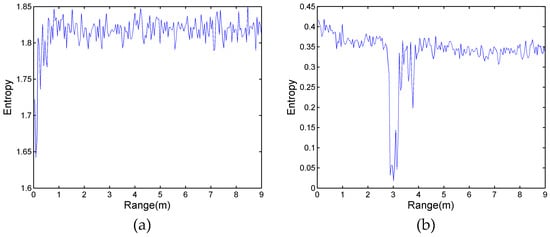 In the frequency spectrum analysis of Figure 6, the respiration of the human target produces a narrow-band spectrum; it indicates that the respiration signal is regular. However, the signal of the noise produces a very wide-band spectrum, which indicates that noise is disordered. According to entropy theory, a regular signal is inclined to produce lower-value entropy. Conversely, a completely random signal, such as clutter and noise, is inclined to a higher entropy value. In order to eliminate the effect of wavelet entropy, two experimental scenarios with no human target and a single human target located at 3 m are implemented. The wavelet entropy spectrum of these two scenarios is exhibited in Figure 8. Figure 8a shows that the entropy value of the experiment with no human target fluctuated as the range was processed. Excluding the influence of the reflection of the wall from 0 m to 1 m, the entropy value of the remaining region is from about 1.79 to 1.85. In Figure 8b, as the target is located at 3 m, the entropy value of the target is the lowest, owing to the trailing effect of the target, and the entropy value at 3.8 m is lower than the other noise region.