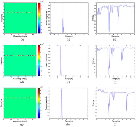 According to the result of Figure 8, the entropy value displays a significant difference in the condition with a human target or without a human target. In this section, the proposed algorithm is also applied for locating the distance of multi-stationary human targets. Figure 9c,f,i show the results of the first case of experimental data processed by wavelet entropy. In these three Figures, the entropy value at 3 m is the lowest, which indicates that the position of target A is accurately estimated. Likewise, another lower entropy value—5 m in Figure 9c, 6 m in Figure 9f, and 7 m in Figure 9i—indicates the position of target B in the three experiments. However, it is noteworthy that the entropy values within 1 m behind target A are lower than the rest of the remaining region in the two Figures; it is easy to incorrectly deduce that one human target is located in this region. According to the theory of electromagnetic wave propagation, as a result of multipath effects and tailing effects, the ground reflects the respiration signals of target A, and the signals behind target A are regular and have the same frequency as the respiration of target A. Furthermore, the respiration signals appear in several neighboring cells and the physical size of the human body is not ignorable. In Figure 9c, the entropy pit of target A is from 2.835 to 3.24 and the entropy pit of target B is from 4.905 to 5.31. In Figure 9f, the entropy pit of target A is from 2.61 to 3.15 and the entropy pit of target B is from 5.76 to 6.25. In Figure 9i, they are from 2.61 to 3.10 and from 6.93 to 7.33; the six ranges of pits correspond to the thickness of the human body. For the lower entropy value that is behind target A, the range of the pits does not obviously agree with the thickness of the human target. Thus, the algorithm of the wavelet entropy can detect two stationary human targets accurately despite one person being in the shadowing region.