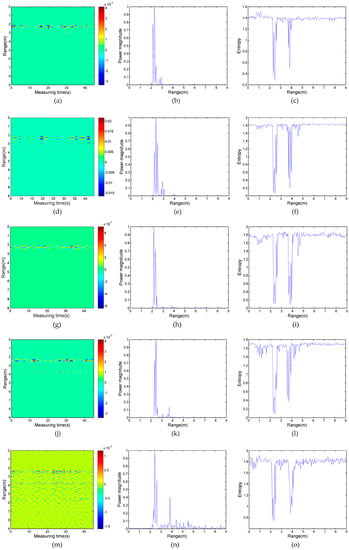 Real experimental data were processed by the wavelet entropy algorithm and two reference algorithms based on the adaptive filter and power spectrum. The experiment results of the first and the second experimental case are shown in Figure 9 and Figure 10. In Figure 9, only one periodically-varied strip that corresponds to the respiratory-motion response is obvious at the range of 3 m in Figure 9a,d,g. The results of the power spectrum in Figure 9b,e,h are similar to the above pseudo-color, with only one peak located at 3 m away from the radar in each Figure, respectively, which are correlated with target A. The energy of target B (at 5 m, 6 m, and 7 m in the first experimental case), who was located in the shadowing region, is negligible compared to that of target A. Thus, the method based on an adaptive filter and energy detection could easily induce a false negative result.