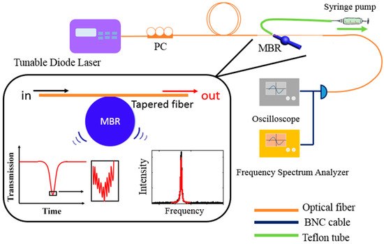 The experimental setup and illustration of the measuring system. Laser, from a tunable laser (Anritsu Tunics Plus CL), is coupled to a micro-bubble resonator (MBR) by a tapered fiber. Polarization controller (PC) in the path is used to control the polarization of the laser. A high speed photoelectric detector (PD) is employed to collect optical signals and convert optical signals into electrical signals. The electrical signals are divided into two ways to the oscilloscope and frequency spectrum analyzer by the BNC (Bayonet Neill-Concelman) cable. The transmission of the laser will contain the mechanical oscillation frequency and can be obtained by the frequency spectrum analyzer. The MBR samples are connected with a syringe pump for the liquid injection.