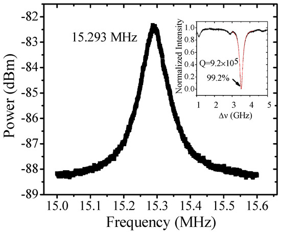 Mechanical spectra of a hollow micro-bubble resonator (MBR) (diameter 168 μm and wall thickness 5–6 μm) at 6.5 mW laser pump. Inset: The transmission spectrum of the optical resonant mode. The quality factor of the mode is 9.2 × 105 measured at low laser power.