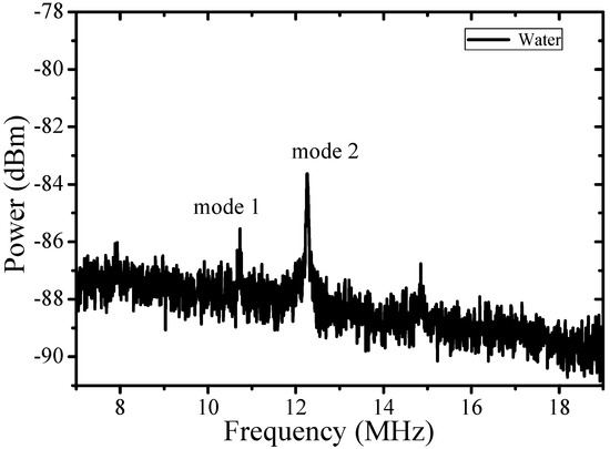 The hollow structure of MBR provides a way to change the mechanical properties of the system by filling it with different liquids. Such a solid-liquid hybrid cavity largely changes the optical mode field distribution in thin wall cavities. Meanwhile, the mechanical response can be different even in relatively thick wall cavities, because the mechanical resonant wavelength is much longer. Therefore, the mechanical frequency and the effective mass of the system can be regulated drastically. Figure 5 is the mechanical spectrum of a water-filled MBR. The MBR has an outsider radius of 140 μm and wall thickness of 7 μm (the same sample as that in Figure 4a). There are two mechanical modes in a range of 10–12 MHz, excited by the same optical mode (Q = 5 × 105). The OSE of the two modes are shown in Figure 6a,b. The effective mass of the two modes are 0.6 × 10−9 kg and 0.4 × 10−9 kg, respectively. Note that in water-filled MBR, mechanical mode frequency shifts toward lower frequency. However, the effective mass of the mode is nearly an order of magnitude less than that of the hollow MBR, which is extraordinary considering that the real mass of a liquid-filled bubble increases.