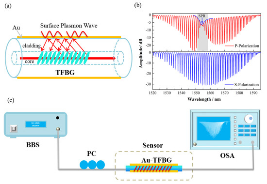 (a) Schematic diagram of the tilted fiber Bragg grating (TFBG)-based surface plasmon resonance (SPR) (TFBG-SPR) sensor. (b) Transmission spectra of the sensor under P and S polarization; SPR occurs when P-polarized light strikes an electrically conducting gold layer at the interface. (c) Experimental setup for detection; the TFBG was excited by a broadband source (BBS), and its transmission spectrum was monitored by an optical spectrum analyzer (OSA).