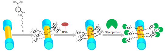 Glycoprotein is a vital physiological active object, which is made from many covalent forms of polypeptide and oligosaccharide. In recent years, it has been demonstrated that glycoprotein is related to many diseases, such as diabetes, neurodegenerative disorders, cancer, and metastasis [10,11,12]. The glycoprotein of the cell surface can fall into blood circulation, so the detection of glycoprotein has been a powerful tool for disease diagnosis. Traditional techniques for glycoprotein detection include fluorescent probes, glucose oxidase sensors, and lectin-aggregated colloides [13,14,15,16]. However, most of these methods are vulnerable to sample contamination. Therefore, the development of systems with a low cost, a compact size, and good stability for highly sensitive and selective detection of glycoprotein is important for monitoring the saccharides in cell-to-cell interactions and biological recognition.