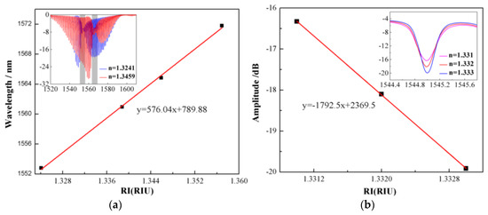 To verify the viability of the biosensor, we tested this fiber SPR sensor using sodium chloride solutions with different refractive indexes (RIs). Sodium chloride solutions with different concentrations in deionized water were prepared as samples, and the RIs were measured with an Abbe refractometer (WAY-2S, accuracy of 0.001). In the experiment, sodium chloride solutions with RIs of 1.3241, 1.3388, 1.3459, and 1.3562 were pumped into the flow cell by a peristaltic pump (BT-100 2J, Longer) in turn. It is known that the large portion of the evanescent field of the hybrid plasmon wave propagating along the gold coating surface significantly enhances the sensitivity of the cladding modes located within the SPR position to the SRI. The SRI sensitivities of the TFBG wavelength and amplitude variations are shown in Figure 3a,b, respectively. The wavelength of the cladding mode obvious shifted toward the longer wavelength, while the RI increased from 1.3241 to 1.3562. It is shown that a good linear fitting curve is obtained for the SRI sensing range from 1.320 to 1.360 in Figure 3a. The result shows that the RI sensitivity of the SPR channel was 576.08 nm/RIU. Unfortunately, due to the limitation of the wavelength resolution of the OSA, it is hard to achieve an SRI resolution down to 10−5. Instead, we measured the amplitude change of the cladding mode of the TFBG-SPR sensor at the resonance wavelength. As shown in the inset of Figure 3b, the amplitude of the cladding mode near the SRP region reduced as the SRI increased with a high sensitivity. A small change of RI from 1.3310 to 1.3330 results in a notable and linear decrease in cladding mode amplitude from −16.329 to −19.914 dB. This shows that these amplitude changes can be used as the SPR response to RI, yielding a significant sensitivity up to −1792.5 dB/RIU.
