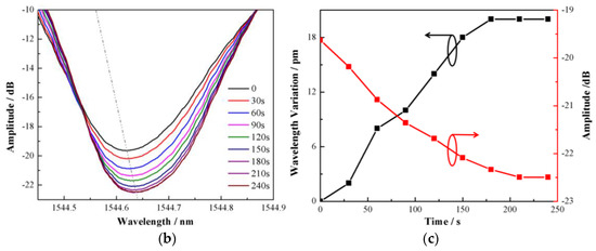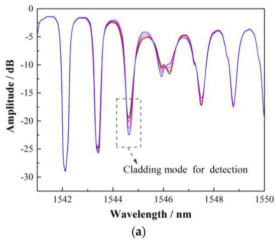 (a) The wavelength response of TFBG-SPR, attained by extracting the wavelength shifts of the most attenuated resonance in the spectrum (i.e., the SPR resonance). The measured sensitivity is 576.04 nm/RIU. (b) The amplitude variation of TFBG-SPR. The sensitivity is up to −1792.5 dB/RIU, obtained from the slope of the fitting curve.