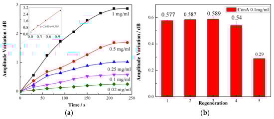 (a) The different concentrations of concanavalin A (Con A). The variation was 0.252 dB, 0.573 dB, 1.020 dB, 1.689 dB, and 2.867 dB when the concentration was 0.02 mg/mL, 0.1 mg/mL, 0.25 mg/mL, 0.5 mg/mL, and 1 mg/mL, respectively. (b) The regeneration of the developed TFBG-based sensor. The relative standard deviations were 0.69%, 2.44%, 2.79%, 5.76%, and 49.39%, respectively.