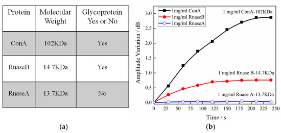 To evaluate the binding selectivity of our sensor, four proteins (bovine serum albumin (BSA), Con A, Rnase B, and Rnase A) were chosen as the samples for testing. The molecular weight and types are given in the insets of Figure 6a. The bovine serum albumin (BSA) was used to block the unreacted carboxyl on the sensor surface, while Rnase A was employed to demonstrate the selectivity of the TFBG-SPR sensor. As for different kinds of glycoprotein, Con A and Rnase B demonstrate that the difference in molecular weight distinguishes the interaction of boronic acid derivative from that of different glycoproteins. As shown in the insets of Figure 6b, the boronic acid derivative effectively separated the glycoprotein from the non-glycoprotein under a consistent concentration. Additionally, the sensor has a negligible response to the non-glycoprotein. It also shows different responses depending on the molecular weight of the glycoprotein. As expected, boronic acid can more easily catch the “bigger” glycoprotein compared with the “smaller” one.