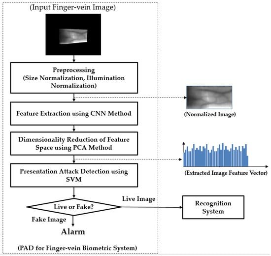 Although the finger-vein recognition method has been used as an alternative for traditional methods, it is still vulnerable to attackers [23,24,25,26,27,28]. To protect the finger-vein recognition from attackers, we propose a new PAD method for the finger-vein recognition system based on feature extraction by CNN and post-processing by PCA and SVM methods for dimensionality reduction of feature space and classification, respectively. In Figure 1, we depict the flowchart of a typical finger-vein recognition system to which our proposed method can be applied. In this figure, our proposed method is depicted inside the rectangular box with the dotted lines. As shown in this figure, our proposed method is the first processing block and it is responsible for detecting the presentation attack finger-vein images before they can be input into the finger-vein recognition system. To detect the presentation attack finger-vein images, our proposed method contains several processing blocks, including the preprocessing steps, image feature extraction, feature selection, and classification, as shown in Figure 1.