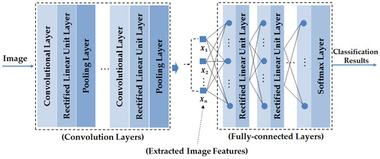 In the recent past, deep learning frameworks have demonstrated results that are superior to traditional methods in the field of computer vision research. For example, deep learning has been successfully applied to various image-based application systems such as face recognition [30], image classification [31,32], hand-writing digit recognition [33], person re-identification [34,35,36], gaze estimation [37], lane road detection [38], eye tracking [39] and face detection [40]. As indicated in these studies, the CNN-based deep learning method outperformed handcrafted methods by demonstrating more accurate recognition results. In Figure 2, we show the general structure of a CNN. As shown in this figure, the CNN comprises of two key parts: the convolution layers and the fully-connected layers. The convolution layers perform the image manipulation processes using the convolution operations to manipulate and extract the image features. Each convolution layer can be followed by a cross-channel normalization layer and/or a rectified linear unit (ReLU) and/or a pooling layer to transform the results of the convolution operation. As a result, we can extract an image feature vector as shown in Figure 2. Using this extracted image feature vector, the CNN uses a neural network (fully-connected layers in Figure 2) to classify the input image into pre-defined categories.