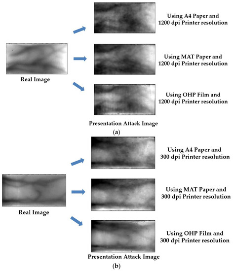 Examples of real and presentation attack finger-vein images in ISPR database: (a) using 1200 dpi printer resolution; and (b) using 300 dpi printer resolution.