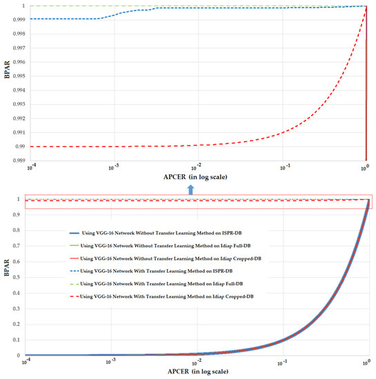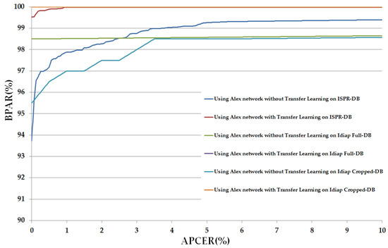 In Figure 7, we depicted the change in APCER according to BPCER values of these above experiments. In this figure, we draw the graph of APCER versus BPAR, where BPAR indicates the bona fide acceptance rate and is calculated as: 100 (%)–BPCER (%). BPAR is defined as the proportion of the bona fide images that were correctly classified as bona fide images. We term this figure as the detection error tradeoff (DET) curve in our research. As shown in Table 10, the detection errors of the Idiap databases (Idiap Full-DB and Idiap Cropped-DB database) were reduced to zero using the transfer learning method. Therefore, DET curves of these experiments are identical, as shown in Figure 7, which indicates that transfer learning is more suitable for training and convergence of CNN than the conventional training method of CNN. In addition, this figure also demonstrates the ability of Alex network in detecting the presentation attack finger-vein images by producing small detection errors.