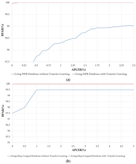 In the last part of Table 13, we show the results of the experiments using Idiap Full-DB and Idiap Cropped-DB databases. Using the Idiap Full-DB database, we obtained the smallest errors of 0.0% in both the cases: with and without using transfer learning method. Thus, the DETs of experiments using Idiap Full-DB database are ideal curves. Therefore, we do not draw them in Figure 10. Using the Idiap Cropped-DB database, we obtained the smallest error 1.0% using RBF kernel of SVM method. This error is reduced to 0.00% using the transfer learning method. Figure 10b shows the DET curves of these experiments. Through the experiments described in Section 3.2.1 and Section 3.2.2, we conclude that the proposed method that used the CNN with transfer learning and post-processing by PCA and SVM outperformed the conventional CNN-based method for PAD for finger-vein biometric system. By comparing the PAD errors in Table 10, Table 11, Table 12 and Table 13, we can see that the VGG-16 network delivered a slight higher detection accuracy (high detection accuracy is indicated by low detection error) than the Alex network. This result confirms the effects of the depth of CNN on the detection system. In addition, it can be observed in Table 12 and Table 13 that the best detection accuracy (the smallest error value) of ISPR-DB database was 0.0311% using linear kernel of SVM method; and similarly, those of Idiap Full-DB and Cropped-DB database were 0.00% using the linear or RBF kernel of SVM method. We conclude that the linear kernel is more efficient than the other kernels (RBF and polynomial kernels) in the proposed method for PAD problem.