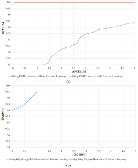 Similar to the experiments with ISPR-DB, we continue measuring the detection performance using Idiap databases (Full-DB and Cropped-DB database) and the results were shown in the later part of Table 12. As shown in this table, we obtained the smallest error (ACER) of 0.0% RBF kernel of SVM method on Idiap Full-DB database without applying the transfer learning method. With transfer learning method, this error is also 0.0% using RBF kernel. Because the errors of both cases are 0.0%, the DET curves of these experiments are the ideal curves (the horizontal curves at BPAR of 100%). Therefore, we do not show them in Figure 9. Finally, using the Idiap Cropped-DB database, we obtained the smallest error (ACER) of 1.0% using RBF kernel of SVM method. This result is reduced to 0.0% with the application of transfer learning method and linear kernel. The DET curves of system configuration in these experiments are shown in Figure 9b. In summary, we obtained the error of 0.00% using either Idiap Full-DB or Idiap Cropped-DB database using our proposed method and the Alex network.